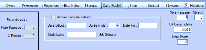 - L'onglet Carte fidélité permet d'activer une carte de fidélité liée au client :